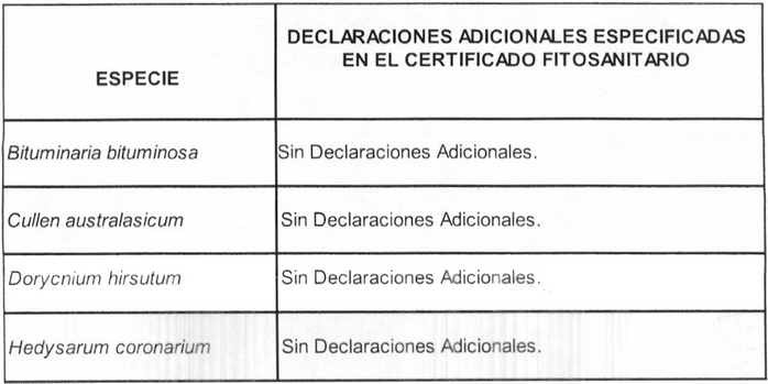 1.1 Agréganse al resuelvo Nº 1 las especies de semillas forrajeras provenientes de cualquier origen y declaraciones adicionales que se listan a continuación, en el orden que alfabéticamente corresponda a cada semilla con su respectiva declaración adicional: