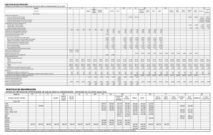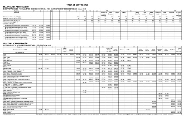 Artículo primero: Fíjase la siguiente Tabla de Costos que establece, para el año 2016, los valores de las actividades que se bonificarán en el marco del Sistema de Incentivos para la Sustentabilidad Agroambiental de los Suelos Agropecuarios, las especificaciones técnicas generales y los niveles mínimos técnicos de aquellas prácticas que correspondan.