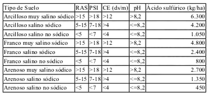 El material a utilizar como enmienda puede ser sulfato de calcio o ácido sulfúrico, según región.