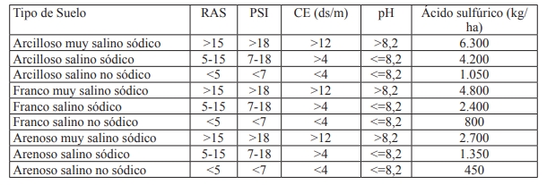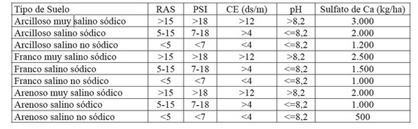El material a utilizar como enmienda puede ser sulfato de calcio o ácido sulfúrico, según región.