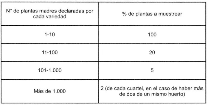 e. En el muestreo de plantas madres se deberá colectar material vegetal por cada variedad declarada. Cada muestra estará constituida por tres submuestras de tres plantas diferentes. Se debe utilizar en referencia la siguiente tabla de muestreo: