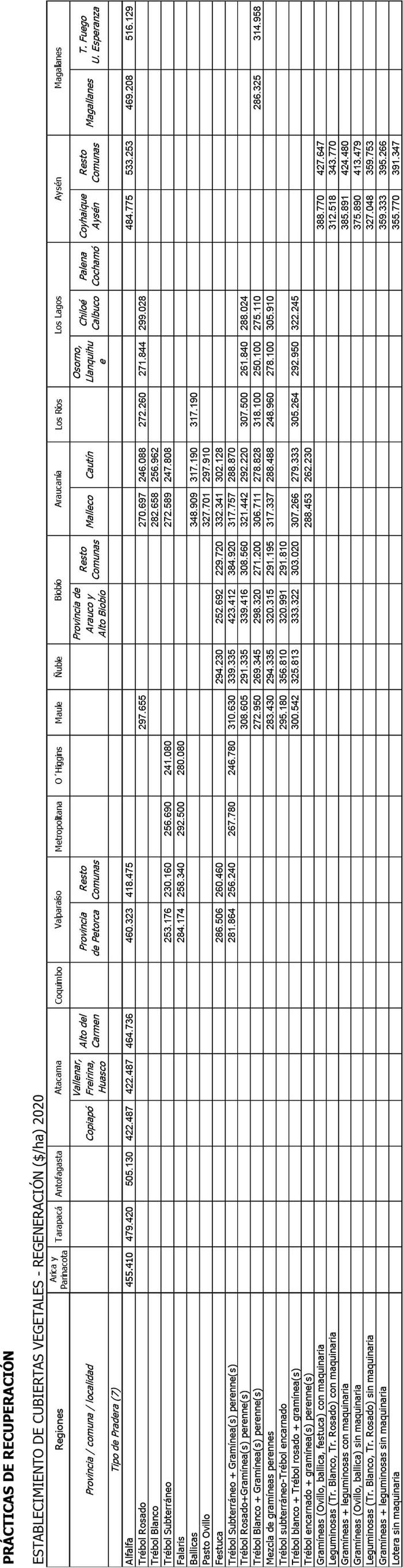 (6) Establecimiento de praderas (ha): Tiene por objeto el establecimiento de especies leguminosas y/o gramíneas en suelos degradados, con el objeto de dar cobertura permanente a éste y proporcionar alimentación animal. Para el caso de establecimiento de praderas sin preparación de suelo, consideradas para la provincia de Palena y comuna de Cochamó (Región de Los Lagos) y Región de Magallanes y de la Antártica Chilena, éstas serán establecidas a continuación de un cultivo anual que deje un suelo mullido y en condiciones adecuadas para la germinación y emergencia de las semillas forrajeras a establecer. Se entenderá por cobertura permanente, el establecimiento de especies o mezclas de éstas, que al menos tengan una duración vegetativa de 3 años o más.