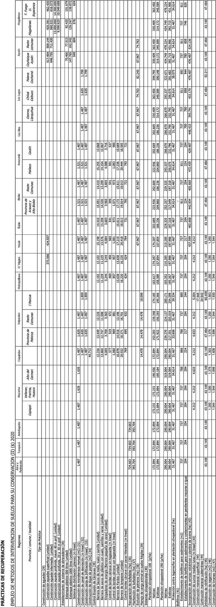 1. Fíjase la siguiente Tabla de Costos que establece, para el año 2020, los valores de las actividades que se bonificarán en el marco del Sistema de Incentivos para la Sustentabilidad Agroambiental de los Suelos Agropecuarios, las especificaciones técnicas generales y los niveles mínimos técnicos de las siguientes prácticas: