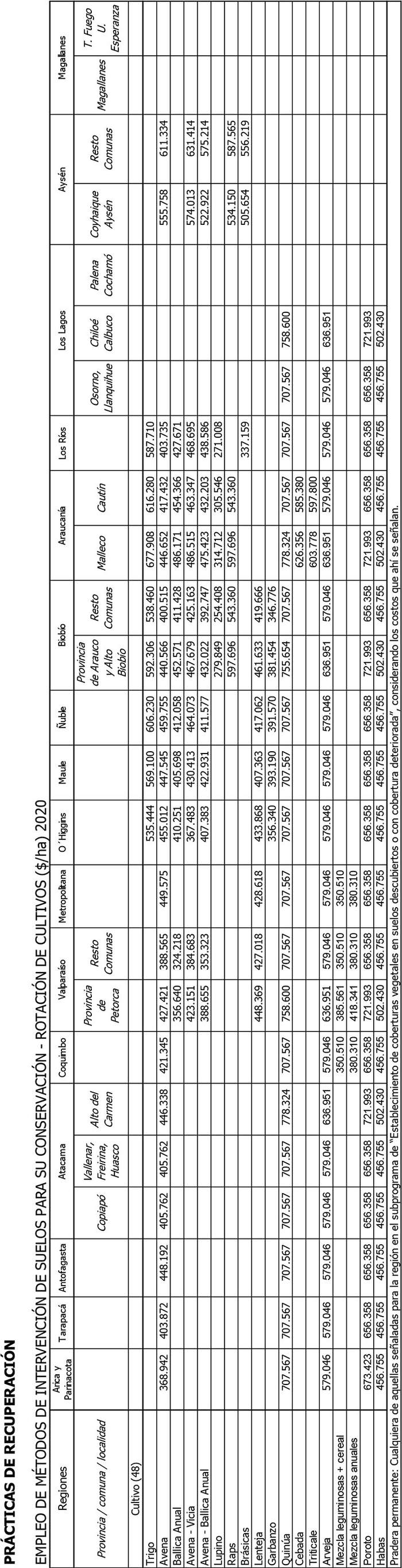 (48) Rotación de cultivos (ha): Secuencia con que se alternan cultivos de diversas características y exigencias, con el fin de lograr el mejor aprovechamiento del suelo, mejorando sus características físicas, químicas y biológicas, sin exponerlo a agotamiento. Esta práctica considera una rotación de tres años. El cultivo cabecera de rotación corresponderá siempre a especie(s) leguminosa(s), el cultivo de segundo año deberá contener un cereal que puede ir solo o asociado a una leguminosa, el cultivo de tercer año corresponderá a una leguminosa o una pradera permanente de aquellas señaladas para la región en el subprograma de "Establecimiento de coberturas vegetales en suelos descubiertos o con cobertura deteriorada".