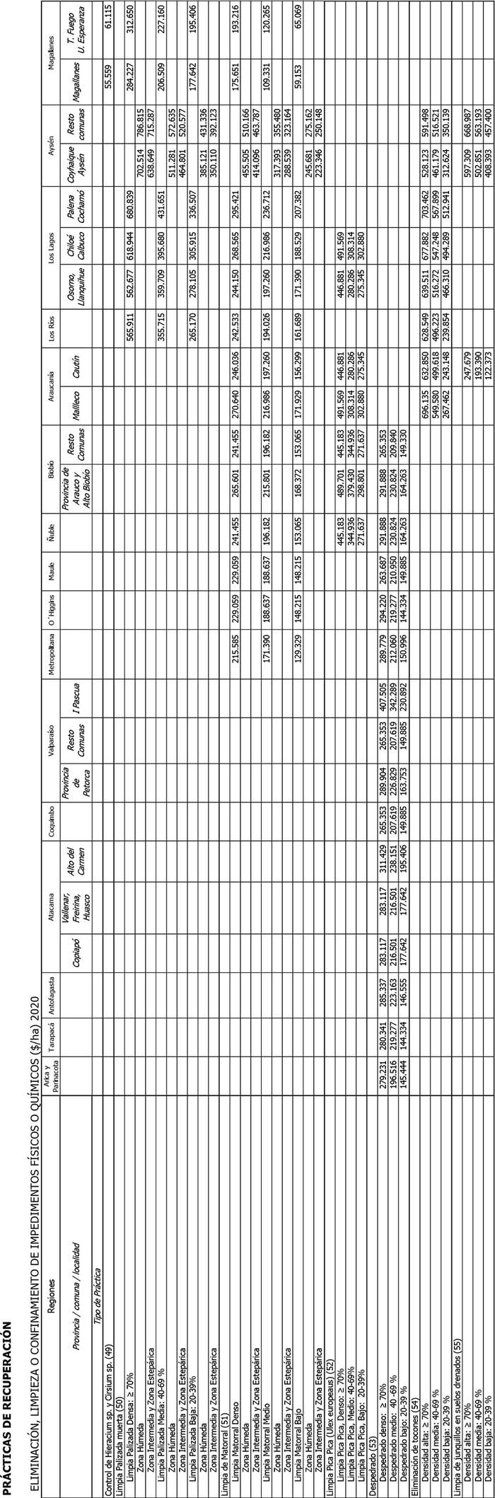 (52) Limpia Pica Pica (Ulex europeaus) (ha): Considera corte, destronque y acopio del material eliminado. Considera corte, destronque y acopio del material eliminado, en densidades altas, medio y bajo, además, el plan de manejo deberá contener el desarrollo de un plan productivo para el área afecta al beneficio.