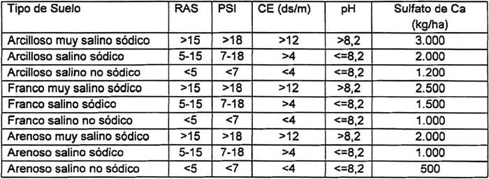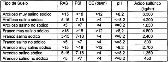 (5) Enmienda ácida: Tiene por objeto corregir suelos que presenten problemas de exceso de sodio y/o sales, donde la dosis de las enmiendas varía según tipo de suelo. Se requiere análisis químico de suelo para la determinación de los siguientes parámetros: