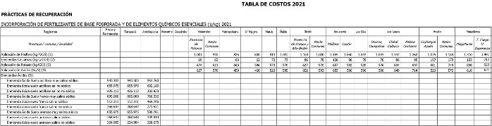 (1) Aplicación de fósforo (kg P2O 5): Tiene por objeto incentivar el uso de una dosis de fertilización fosforada de recuperación en suelos deficitarios. El precio para la unidad de fósforo (P) corresponde al valor del kg de P 2O 5 calculado sobre la base del precio de la unidad de fosforo más barata del mercado. El agricultor podrá emplear el fertilizante fosfatado (soluble en agua) que desee, no obstante, el valor de la unidad de P será siempre el definido en la tabla anual de costos.