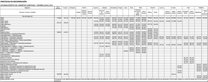 (6) Establecimiento de praderas (ha): Tiene por objeto el establecimiento de especies leguminosas y/o gramíneas en suelos degradados, con el objeto de dar cobertura permanente a éste y proporcionar alimentación animal. Para el caso de establecimiento de praderas sin preparación de suelo, consideradas para la provincia de Palena y comuna de Cochamó (Región de Los Lagos) y Región de Magallanes y de la Antártica Chilena, éstas serán establecidas a continuación de un cultivo anual que deje un suelo mullido y en condiciones adecuadas para la germinación y emergencia de las semillas forrajeras a establecer. Se entenderá por cobertura permanente, el establecimiento de especies o mezclas de éstas, que al menos tengan una duración vegetativa de 3 años o más.