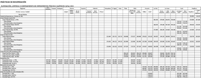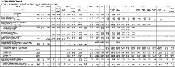1. Fíjase la siguiente Tabla de Costos que establece, para el año 2021, los valores de las actividades que se bonificarán en el marco del Sistema de Incentivos para la Sustentabilidad Agroambiental de los Suelos Agropecuarios, las especificaciones técnicas generales y los niveles mínimos técnicos de las siguientes prácticas: