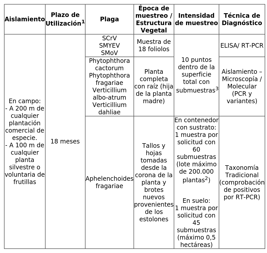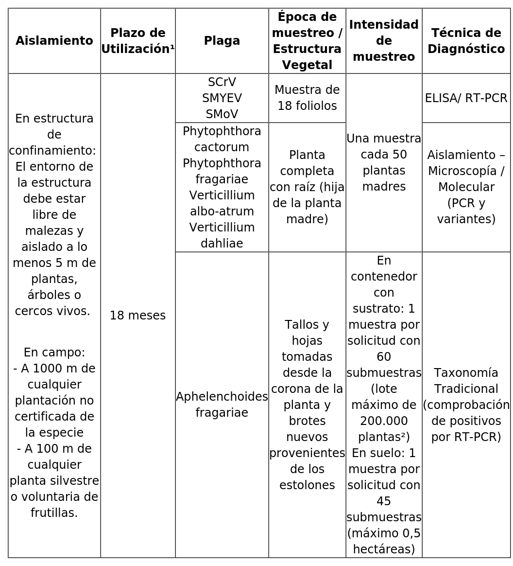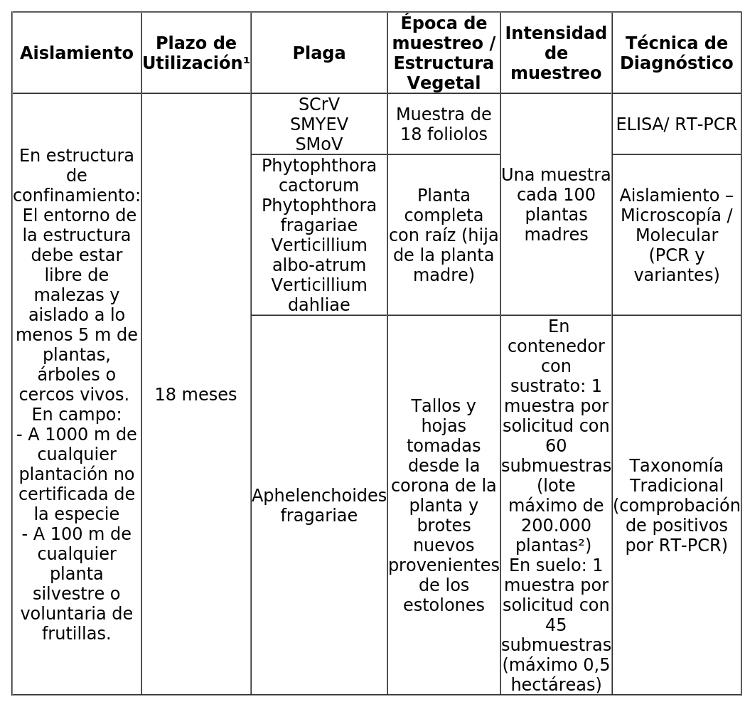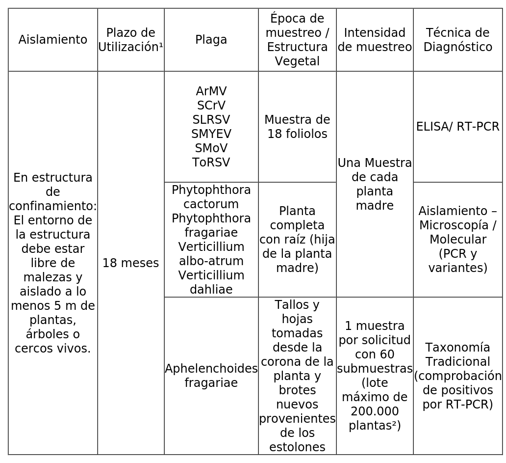 Tabla 6. Requisitos de fitosanitarios, de aislamiento y