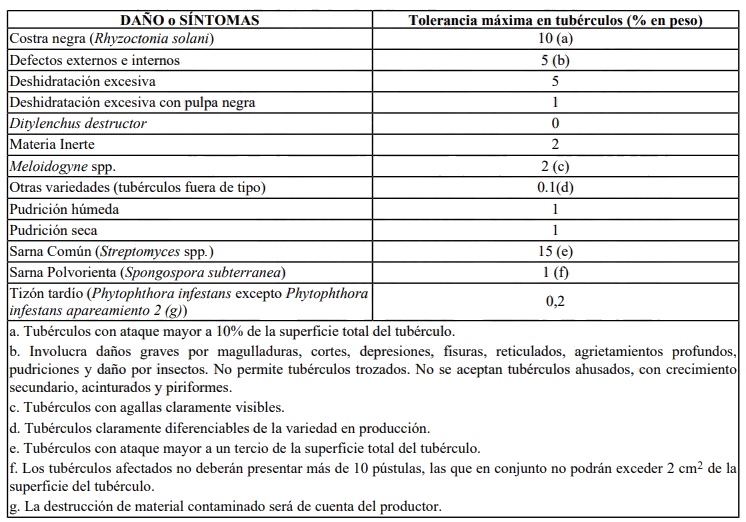 TABLA 1: Tolerancias máxima de daños o síntomas de enfermedades en tubérculos semillas de papa.